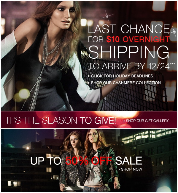 | *To redeem your offer online, enter offer code at checkout: Spend $500 and enter ENJOY150 to get $150 off; spend $250 and enter GET50OFF to get $50 off; or spend $125 and enter code GET20OFF to get $20 off. Valid at bebe.com only. Associates of bebe stores, inc. and affiliates are not eligible. Limit one per client. Non-transferable. Minimum purchase is required. Tax not included in calculating minimum purchase. Cannot be used in conjunction with any other offer, including clubbebe rewards. Other restrictions may apply. Not valid on sale items, gift cards, shipping, previous purchases, or price adjustments. No cash or credit back. Offer valid through 12/24/08. **To redeem in-store, print out and present coupon at time of purchase. Valid at bebe, bebe outlet and 2b bebe stores. BEBE SPORT stores are excluded. Associates of bebe stores, inc. and affiliates are not eligible. Limit one per client. Non-transferable. Minimum purchase is required. Tax not included in calculating minimum purchase. Cannot be used in conjunction with any other offer, including clubbebe rewards. Other restrictions may apply. Not valid on sale items, promotional items, gift cards, shipping, previous purchases, or price adjustments. Coupon is invalid upon redemption at bebe stores. No copies or facsimiles. No cash or credit back. In-store offer valid in the U.S., Canada, U.S. Virgin Islands and Puerto Rico only. Offer valid through 12/24/08. Spend $500 get $150 off DC:5F. Spend $250 get $50 off DC:5E. Spend $125 get $20 off DC:5B. ***Overnight shipping and handling charges will automatically be set at $10 on all orders at checkout. Overnight shipping orders must be placed by noon (PST) on Monday, December 22 for guaranteed delivery by December 24, 2008. Offer not valid for Canadian orders. Offer not valid in stores. Subject to adjustment due to returns, cancellations and exchanges. Non-transferable. Not valid on previous purchases. Associates of bebe stores inc. and affiliates not eligible. Other restrictions may apply. Shipping offers end Monday, December 22, 2008, at 11:59 p.m. PST. Have a question? Call us at 1-877-bebe-777 (1-877-232-3777). We're sending you this email because you are a registered member of bebe.com's email list. If you no longer want to be on our mailing list, opt out anytime by clicking here to unsubscribe. You can also write to us at: Client Services, bebe.com, 400 Valley Drive, Brisbane, CA 94005. | ||